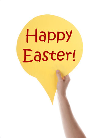 赤吹き出しまたは英語のテキスト ハッピー イースター白で隔離とふきだしを両手 の写真素材 画像素材 Image
